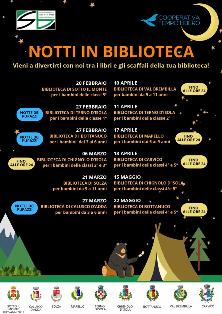 NOTTI IN BIBLIOTECA. Sognare in mezzo ai libri! Un magico appuntamento in un luogo dove abitano i libri, scrigni di parole, immagini e storie. Con il loro sacco a pelo, i bambini iscritti potranno provare per una notte il brivido di dormire in biblioteca! Iniziativa rivolta a bambine e bambini 9-11 anni Iscrizione richiesta: tel.
