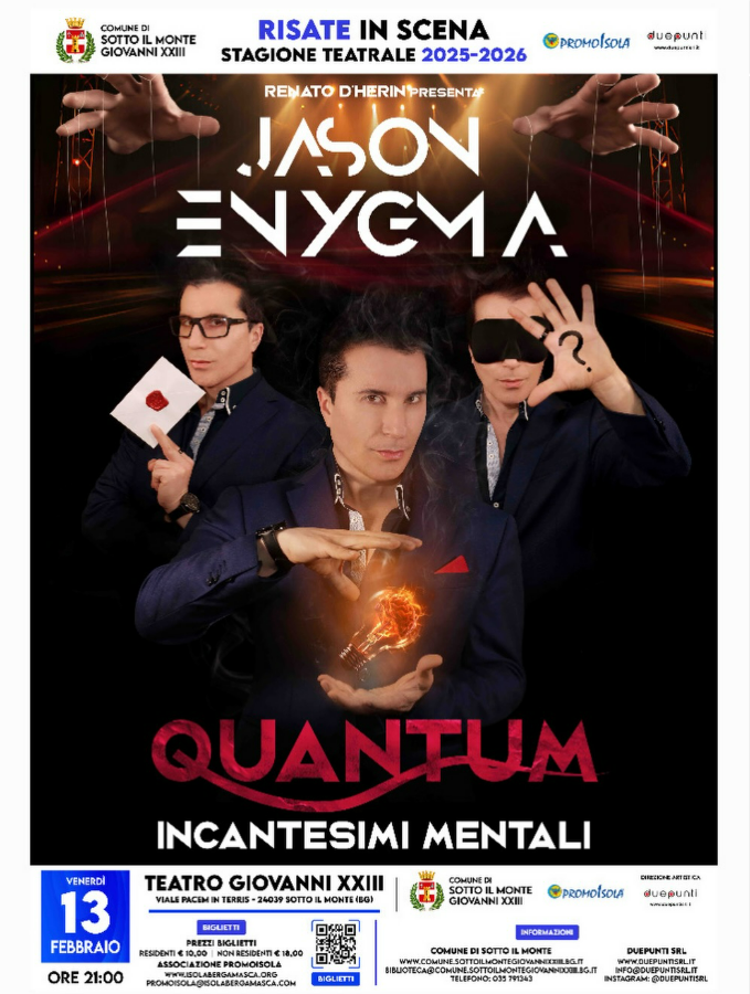 Vi presentiamo uno spettacolo davvero imperdibile: “Quantum: Incantesimi Mentali” di Jason Enigma. Uno show di magia e mentalismo che vi lascerà senza parole… siete pronti a mettere in discussione la realtà? Biglietti: scansionando il QR code sulla locandina, oppure in Biblioteca (pagamento solo con carta, no contanti) • 10€ residenti • 18€ non residenti