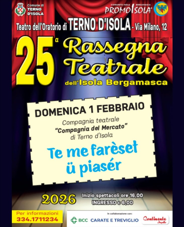 Si informa la cittadinanza che lo spettacolo teatrale “Te me fareset u piaser?”, originalmente in programma lo scorso Novembre, sarà recuperato domenica 1 febbraio! La “Compagnia del Mercato” tornerà sul palco ternese per offrirci simpatia, risate e puro folclore.